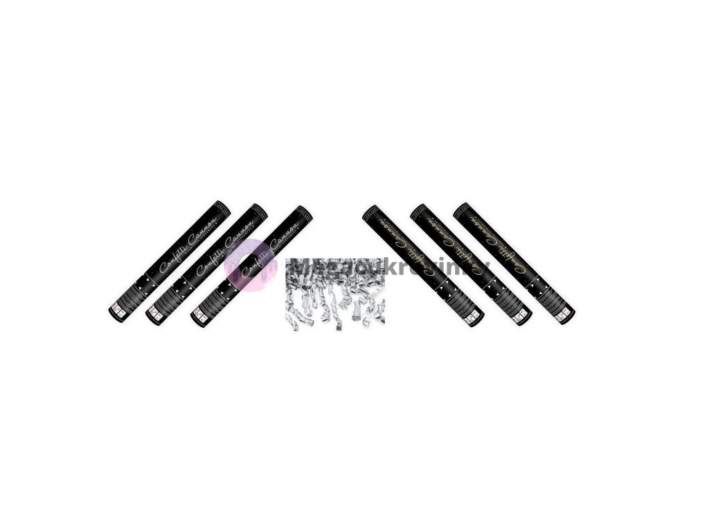 Konfety 40 cm,stříbrné metalické stužky 1m dlouhé. Konfety jsou uloženy ve válcovité tubě. Drží se v ruce a ovládají se mechanickým pootočením tubusu. Po vystřelení vyletí stříbrné metalické stužky do výšky 5 až 8 metrů a rozptýlí se do okolí. Iniciace: stlačený vzduch Tubus: kov Manipulace: pootočení Max délka odpálení: 8 m Bezpečnost: konfety lze použít ve venkovních i vnitřních prostorách. Bezpečná vzdálenost přihlížejících diváků od tuby konfet je 10 metrůParametry dodatkowe