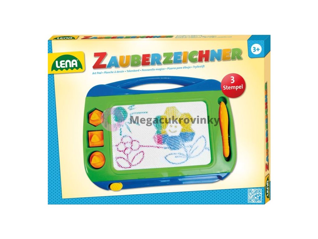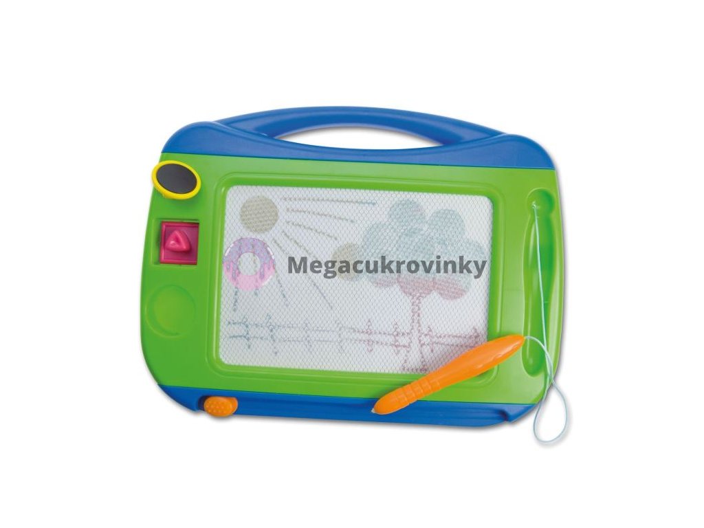 Plastová magická tabulka. Obsahuje tužku s kovovým hrotem, 2x razítko. Při kreslení tužkou s kovovým hrotem tabulka mění barvu kresleného obrázku. Jednouché zacházení. Parametry dodatkowe