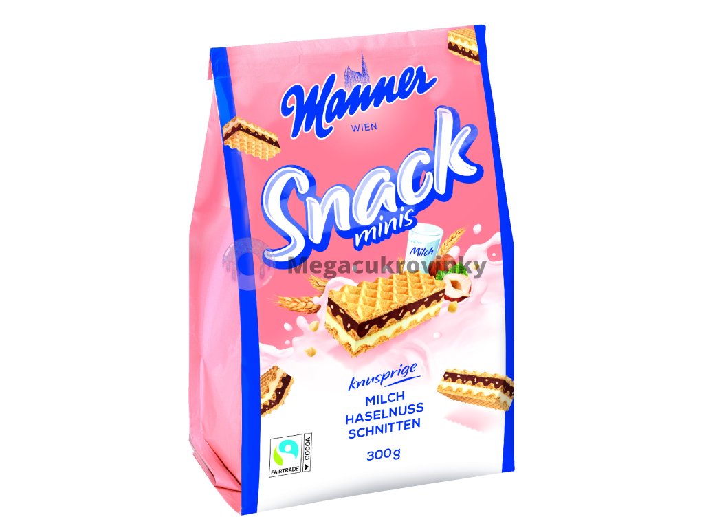 Manner Snack Minis to dwa wyjątkowo chrupiące wafle nadziewane w 40% kremem z orzechów laskowych i w 40% z kremem mlecznym. Małe kawałki ORZECHÓW LASKOWYCH uszlachetniają nasz Manner Snack Minis Milk Hazelnut i doskonale uzupełniają pyszny smak.
