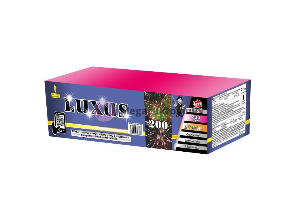 Baterie výmetnic - LUXUS 200 ran, ráže 20 mm EFEKT : barevné pivoňky; stříbrné palmy a chryzantémy; zlaté palmy, vrby a brokáty, finále Výška efektu: cca 50 m. Délka trvání efektu: cca 115 sec. NEC: 1000 g.CLP - Třída nebezpečnosti